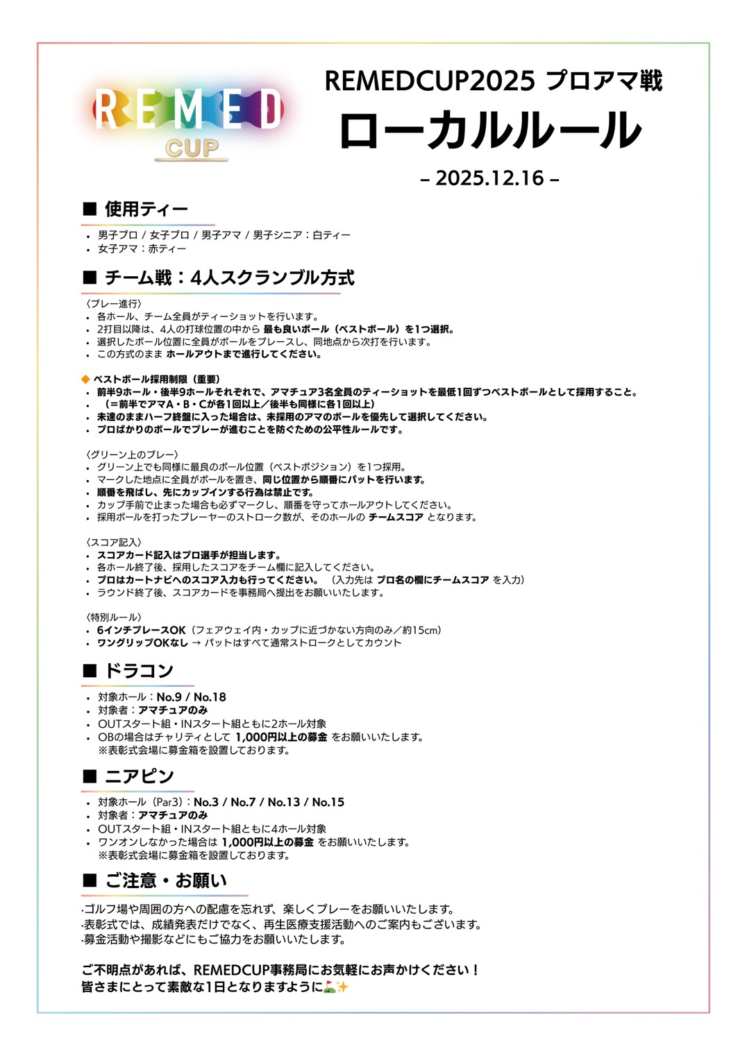 ・ゴルフ場や周囲の方への配慮を忘れず、楽しくプレーをお願いいたします。