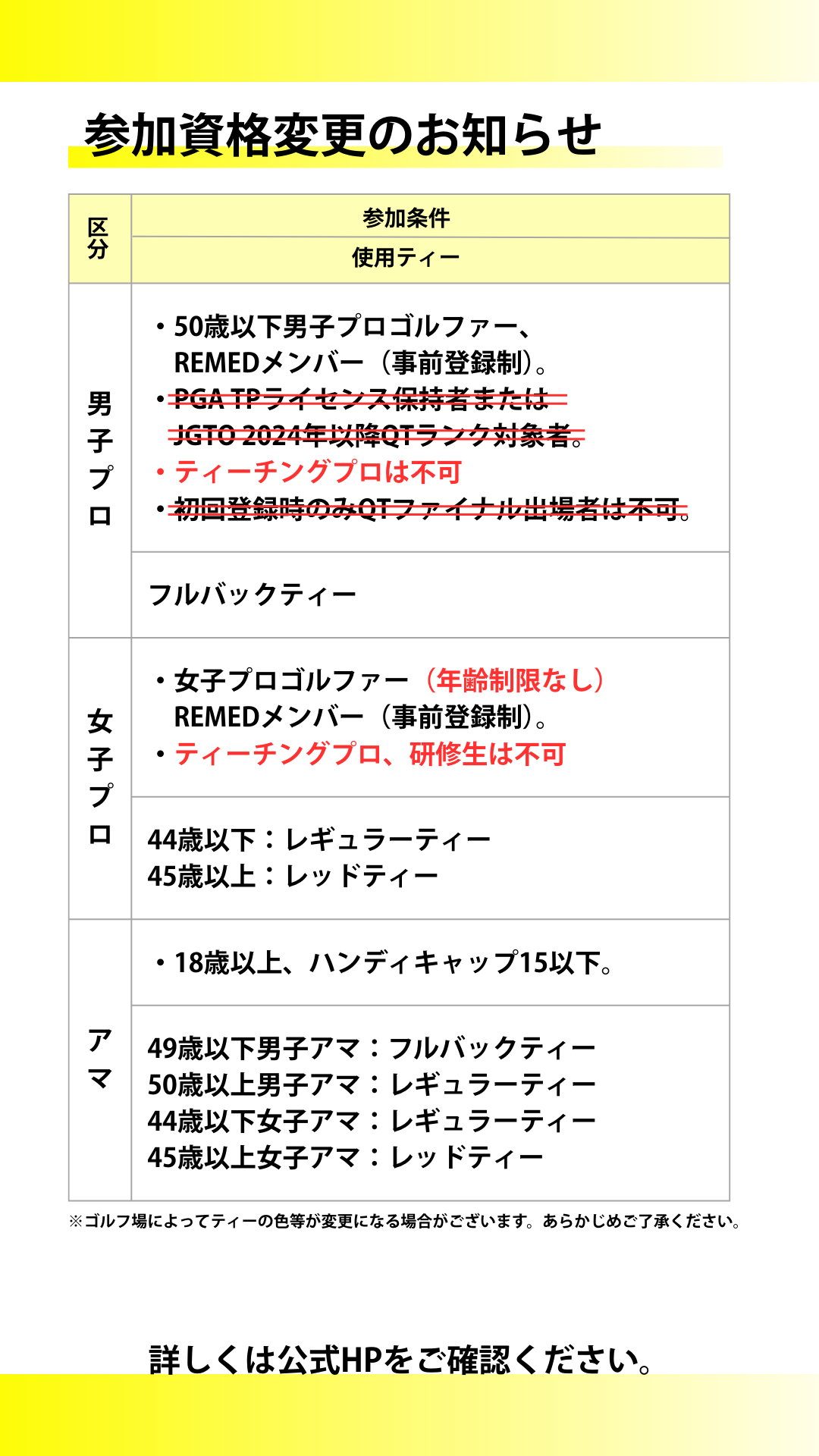 基本条件としていた「PGA TPライセンスまたはJGTOの2024年以降QTランキング対象者」という要件を撤廃しました。