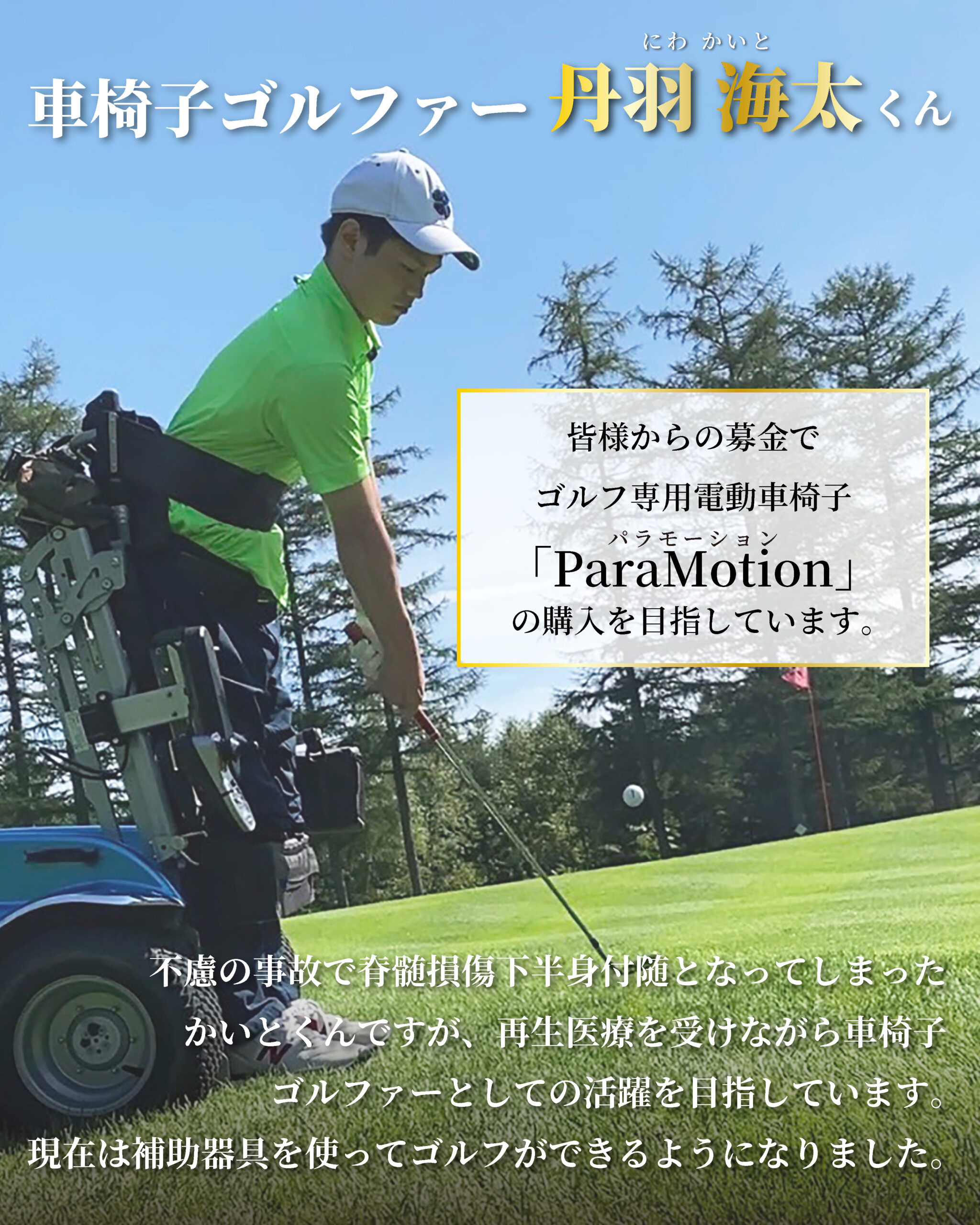 具体的な活動として、REMEDゴルフイベントの開催、チャリティー音楽祭やチャリティーオークションの実施 を行っており、その取り組みの一環として、「カイトプロジェクト」を立ち上げました。このプロジェクトは、プロゴルファーを目指していた丹羽海太くんが、不慮の事故により車椅子生活を余儀なくされながらも、再びゴルフの道を歩むことを支援するものです。彼の夢を叶えるために、車椅子ゴルファーとしての第一歩を踏み出せるよう、支援を行っています。