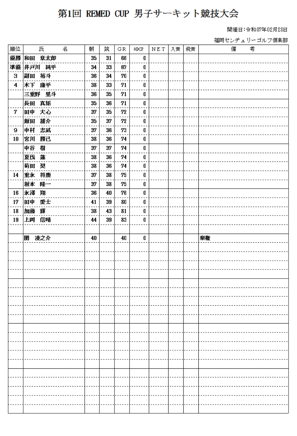 2/28(金)に福岡センチュリーゴルフ倶楽部で行われた 第1回 REMED CUP 男子サーキット競技大会の結果をご案内いたします。