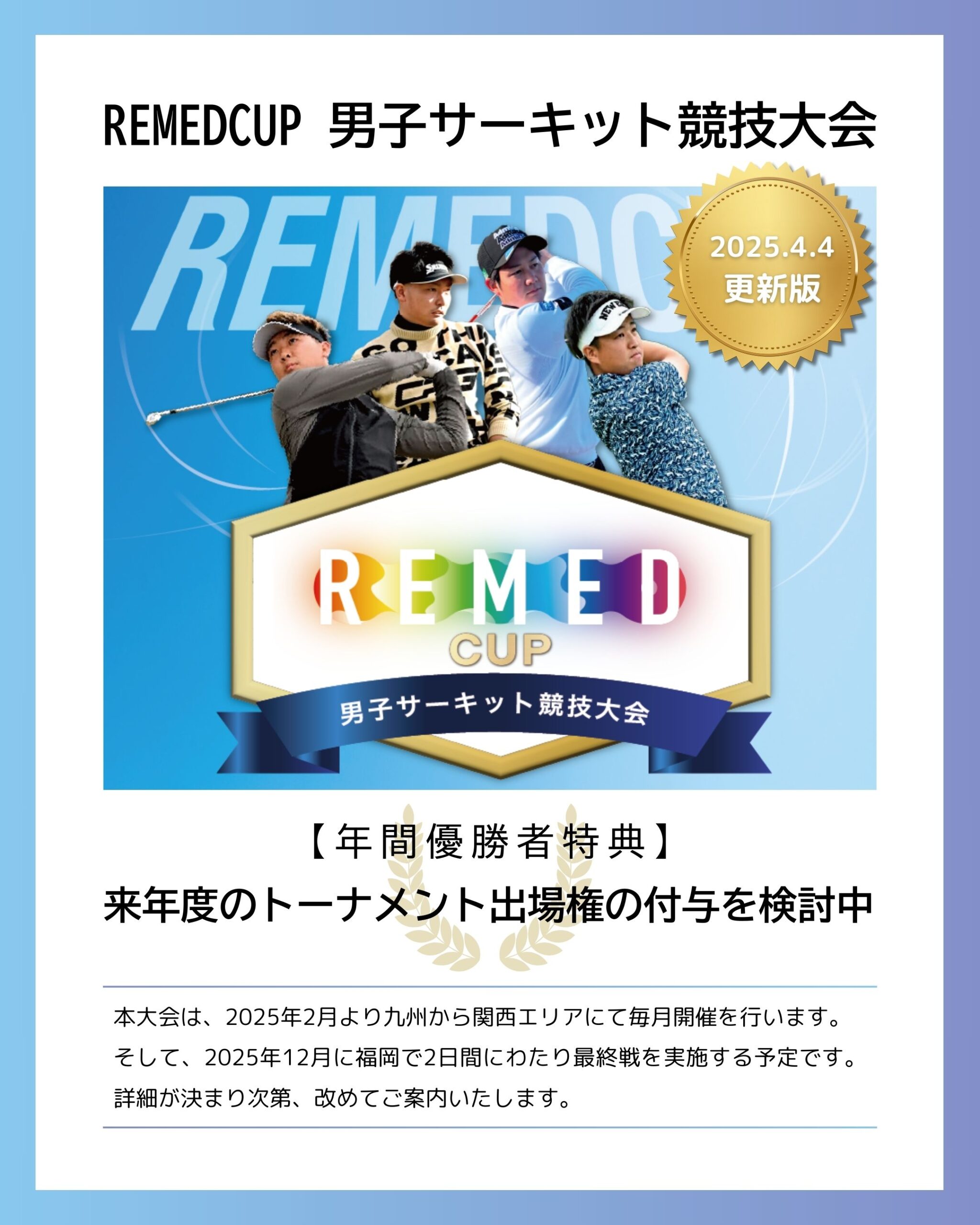 REMEDCUP 男子サーキット競技大会、年間優勝者特典として来年度のトーナメント出場権の付与を検討中です。