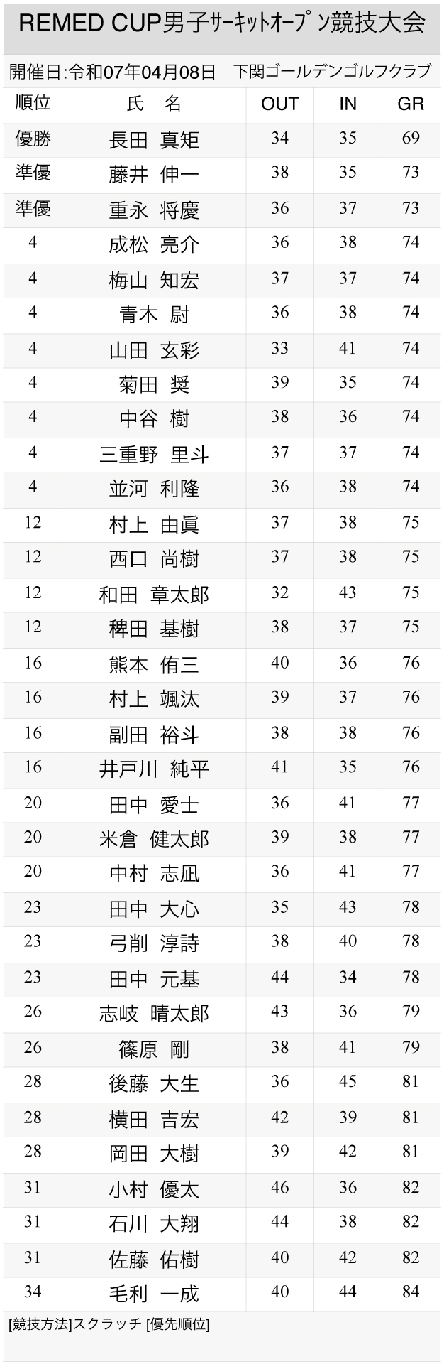 先日4/8(火)に下関ゴールデンゴルフクラブで行われた 第3回 REMED CUP 男子サーキット競技大会の結果をご案内いたします。