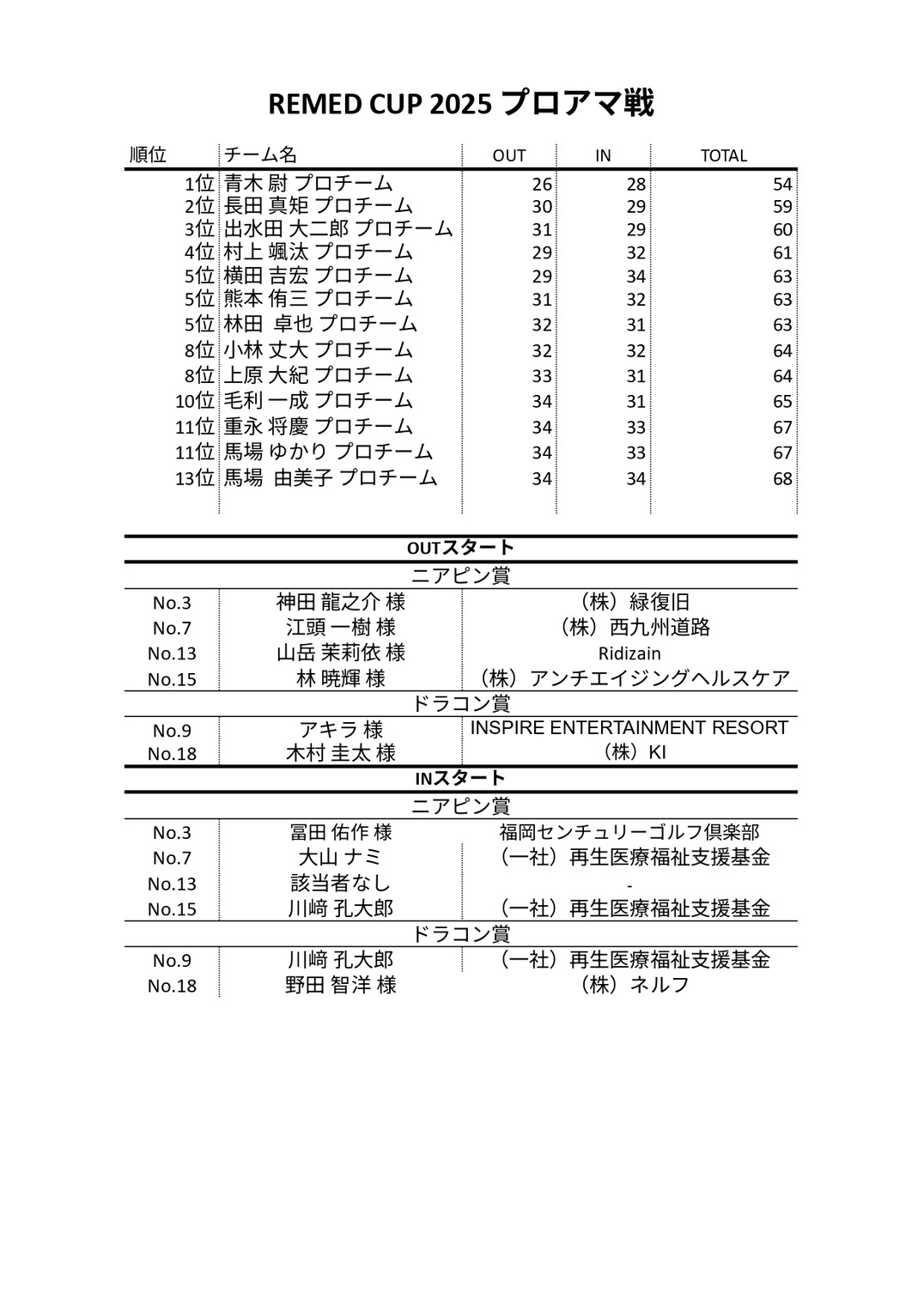 1位青木尉プロチーム 2位長田真矩プロチーム 3位 出水田 大二郎 プロチーム
